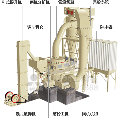 歐版磨粉機整套設備主要由主機、選粉機、風機、顎破、畚斗提升機、電磁振動給料機、儲料倉、布袋除塵器、管道裝置、旋風集粉器、電控柜、電機等組成。