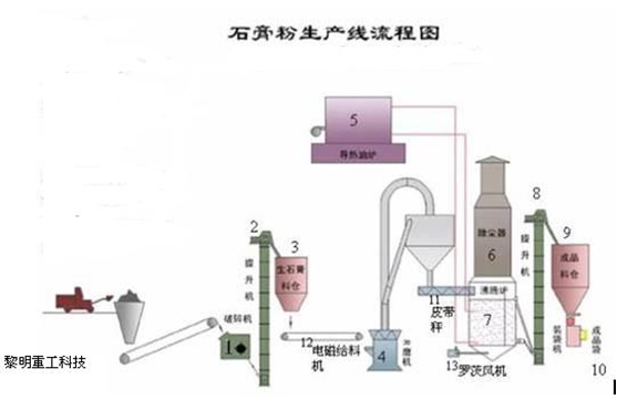 (3)粉磨系統: 物料經電磁振動給料機均勻連續地送入磨機內,進行研磨。粉磨后的石膏生粉由磨機鼓風機鼓出的風流吹出,經過主機上方的分析機進行分級。細度合乎規格的粉末,隨風流進入大旋風收集器,收集后經出粉管排出即為成品。成品落入螺旋輸送機,輸送到下一系統煅燒。整個風路系統是密閉循環的,從大旋風收集器和鼓風機之間的管道引入袋式除塵器,除去空氣中的粉塵,然后排到環境中,確保環境清潔。經過粉磨系統的物料由粒徑0~30mm,改變為80~120目,符合石膏粉細度要求。