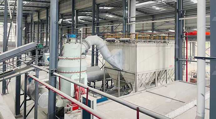 第二階段:磨粉破碎后的重晶石小塊物料經提升機送至料倉,再經振動給料機將其均勻定量的送入磨機研磨室內進行研磨。