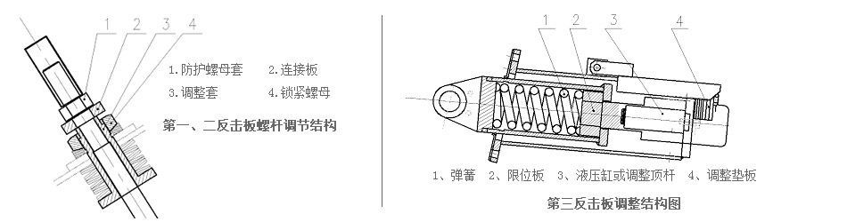 ②墊片式調(diào)整方式: 當調(diào)整排料口時,首先適度擰松拉緊部件的拉桿螺母,松開彈簧,然后再松開擋塊螺栓,松開擋塊,擰緊頂絲螺栓(把液壓起頂機頭部裝入頂頭,旋入機架后的螺母內(nèi),將液壓起頂機的出油閥打開,扳動手柄),頂絲螺栓(頂頭)向前推動調(diào)整座,達到一定的開口度時,取出調(diào)整墊片,以達到增大排料口的需要;若放入調(diào)整墊片,則可達到減小排料口的需要。在達到用戶所需的排料口尺寸后,首先松開頂絲螺栓(可打開液壓起頂機的進油閥,扳動手柄,松開頂頭)調(diào)整座在動顎部件自重的推力作用下,調(diào)整座及調(diào)整墊片組向機架后墻靠攏,壓實,注意頂絲螺栓(頂頭)松開程度應(yīng)達到調(diào)整座向后墻靠攏,壓實后而不相接觸,再擰緊擋塊螺栓,將擋塊與調(diào)整座與機架牢固,適度擰緊拉桿螺母收緊彈簧,即完成調(diào)整排料口的工作。