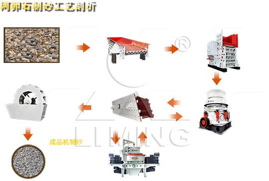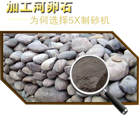 目前河卵石制砂合理的配置是粗碎用顎破,中碎用圓錐破(小產量可用細顎破),制砂用離心沖擊式破碎機(5X制砂機)的三級破碎。