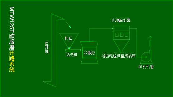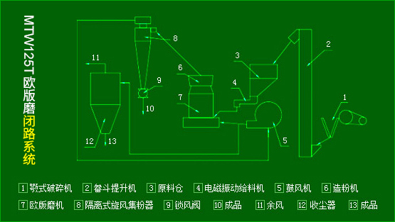 MTW215T歐版磨為立式結(jié)構(gòu),占地面積小,成套性強(qiáng)。主要由主機(jī)、風(fēng)機(jī)、選粉機(jī)、專用除塵器、旋風(fēng)集粉器、管道裝置和電機(jī)組成。配套輔助設(shè)備包括顎式破碎機(jī)、畚斗提升機(jī)、電磁振動(dòng)給料機(jī)、料倉(cāng)、配電柜等。 MTW215T歐版磨為碾壓成粉,是一個(gè)密閉的循環(huán)系統(tǒng),在負(fù)壓狀態(tài)下循環(huán)流動(dòng)。該設(shè)備主要部件均采用品質(zhì)良好鋼材制造,整機(jī)耐用可靠,自動(dòng)化程度高,是目前理想的粉磨設(shè)備。