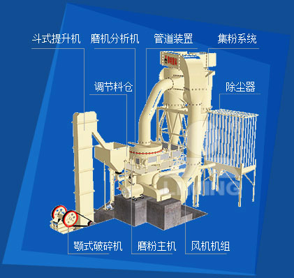 大塊非金屬礦經顎式破碎機破碎后,由斗式提升機送至儲料倉,通過電磁振動給料機均勻連續地送入磨粉機主機內研磨,研磨后的粉末在鼓風機的作用下吹向選粉機進行分選。符合細度的非金屬礦粉由管道輸送到儲料倉;不合格的粒子重回磨粉機內研磨。整個系統在負壓狀態下運行,粉塵不外溢,從而保護了周邊環境。若經脈沖除塵器過濾,環保效果更佳。