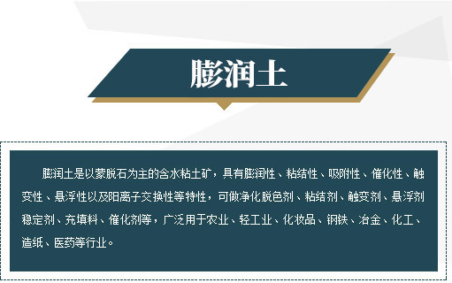 膨潤土是以蒙脫石為主的含水粘土礦,具有膨潤性、粘結性、吸附性、催化性、觸變性、懸浮性以及陽離子交換性等特性,可做凈化脫色劑、粘結劑、觸變劑、懸浮劑穩定劑、充填料、催化劑等,廣泛用于農業、輕工業、化妝品、鋼鐵、冶金、化工、造紙、醫藥等行業。
