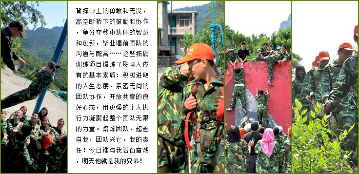 • 背摔臺(tái)上的勇敢和無畏,高空斷橋下的鼓勵(lì)和協(xié)作,爭分奪秒中集體的智慧和創(chuàng)新,畢業(yè)墻前團(tuán)隊(duì)的溝通與配合……這些拓展訓(xùn)練項(xiàng)目鍛煉了職場人應(yīng)有的基本素質(zhì):積極進(jìn)取的人生態(tài)度,親密無間的團(tuán)隊(duì)協(xié)作,開放共享的良好心態(tài),用更強(qiáng)的個(gè)人執(zhí)行力凝聚起整個(gè)團(tuán)隊(duì)無限的力量。熔煉團(tuán)隊(duì),超越自我,團(tuán)隊(duì)興亡,我的責(zé)任!今日誰與我浴血奮戰(zhàn),明天他就是我的兄弟!