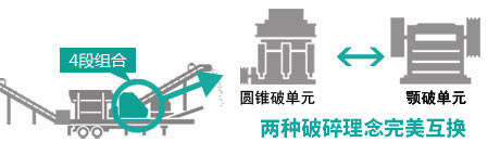 一種車身為8種機型通用,喂料單元互換系統、破碎單元互換系統和篩分單元互換系統,只需再投資單機設備成本,短時間內,即可在同一車身上實現不同型號喂料單元、破碎單元和篩分單元互換系統,整機各系統之間的準確匹配,適應場合更廣泛,破碎功能更優良,客戶的消費品得到增值。