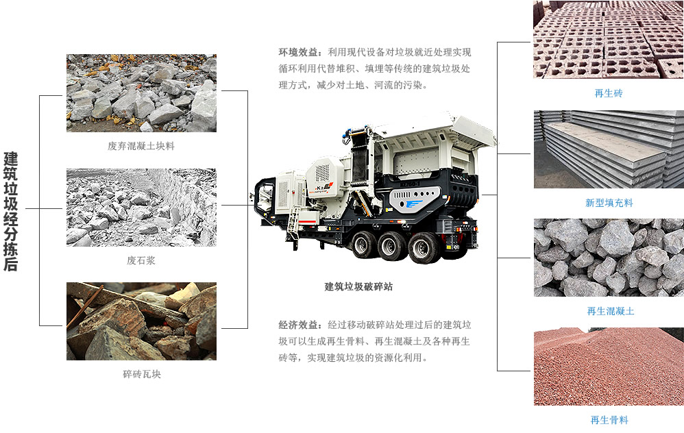 經濟效益:經過移動破碎站處理過后的建筑垃圾可以生成再生骨料、再生混凝土及各種再生磚等,實現建筑垃圾的資源化利用。
