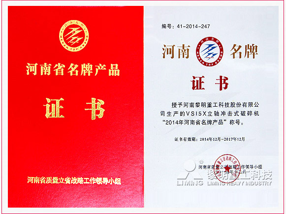 2015,羊年伊始,VSI5X斗志昂揚,斬獲“河南省名牌產品”稱號,也是繼2014年摘得河南省科技進步三等獎后,又一次憑借硬實力成為眾人矚目的焦點。“名牌產品”由省質量立省戰略工作領導小組進行嚴格評審,經過企業申報、資料審查、顧客滿意度調查、專家認定、領導小組審定、公告等程序,在全省10個主要行業中評選出336個名牌產品,VSI5X立軸沖擊破成功入列。