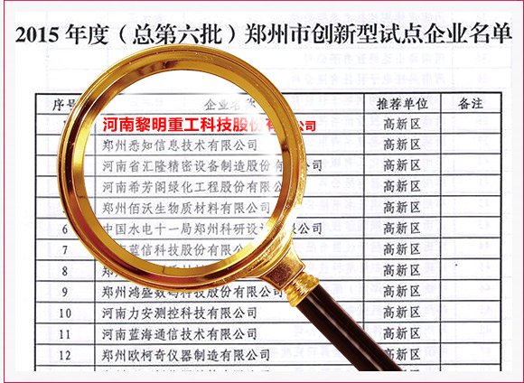 2015年11月30日,鄭州市科技局公布了第六批市創新型試點企業名單,在這份涵蓋50家創新型企業的名單中,黎明重工作為一家工程機械企業位列榜首,在百家爭鳴的市場上,再次得到了專業和高度上的認可。