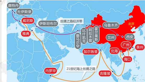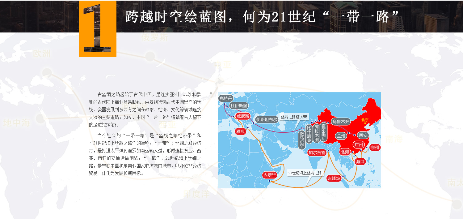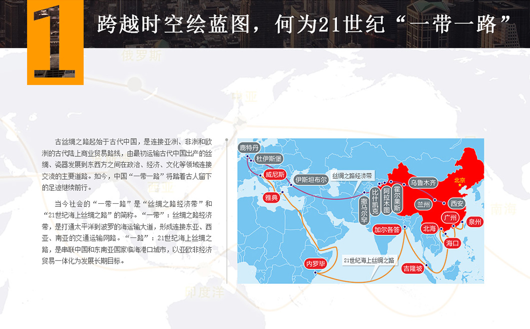 當今社會的“一帶一路倡議”是“絲綢之路經濟帶”和 “21世紀海上絲綢之路”的簡稱。“一帶”:絲綢之路經濟帶,是打通太平洋到波羅的海運輸大道,形成連接東亞、 西亞、南亞的交通運輸網路。“一路”:21世紀海上絲綢之路,是串聯中國和東南亞國家臨海港口城市,以亞歐非經 濟貿易一體化為發展長期目標。