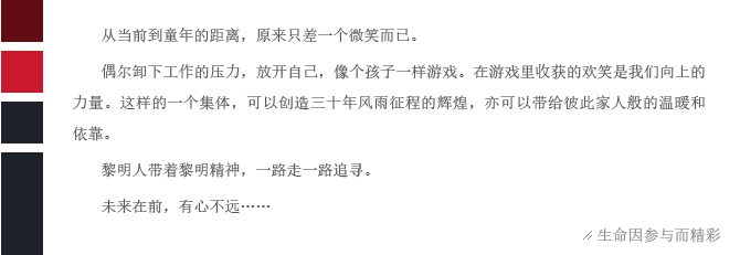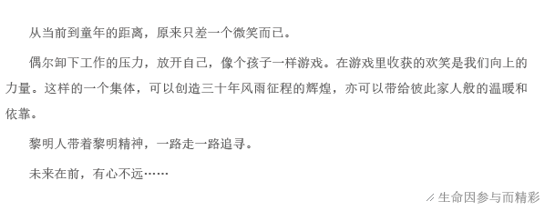 看起來(lái)些許幼稚的游戲卻讓一群人脫下工裝,如孩童般歡呼跳躍。和有趣的人一起做有趣的事,快樂(lè)從未這樣簡(jiǎn)單過(guò)。